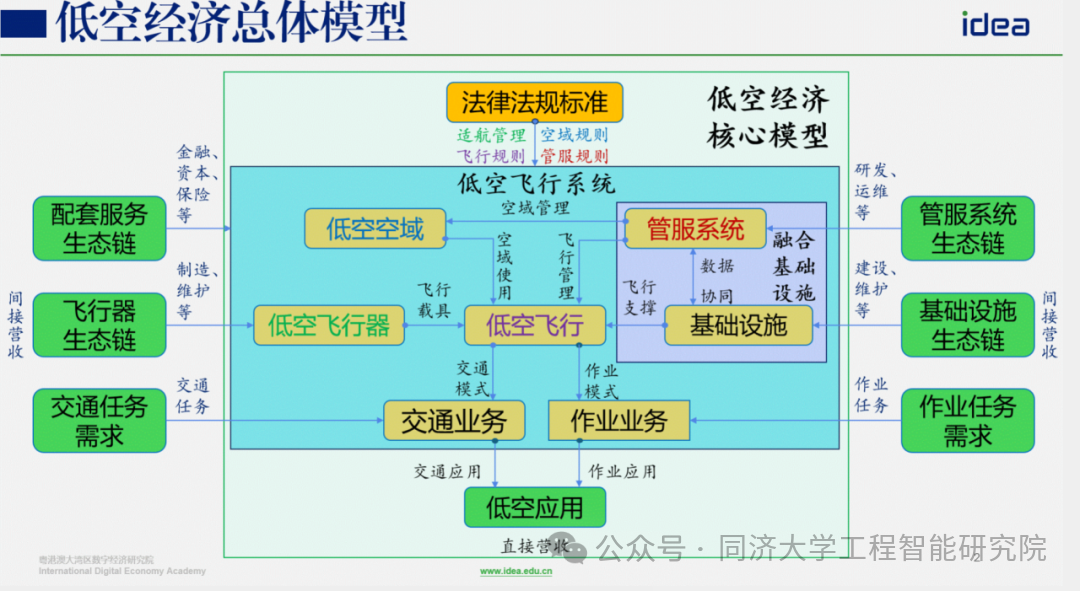 关于低空经济,目前在国内已形成广泛共识。我们提出的“低空经济总体模型”系统概括了该领域的整体架构:上层是由国家政策与法律法规构成的支撑体系,中间的核心层是低空飞行系统,涵盖了低空空域、飞行器、管理体系及技术措施,外围则代表与经济相关的产业生态。此外,我们将低空业务主要划分为两类:一类是具备交通属性的客运与物流等运输业务,另一类则是依托飞行器执行各类生产任务的作业应用。