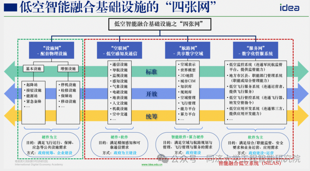 为解决这些挑战,深圳正构建“智能融合低空基础设施”,其核心由“四张网”组成:设施网(物理基础设施)、空联网(通导监设施,实现空域数字化)、航路网(在数字低空中进行各种冲突检测与航路动态计算)和服务网(对外提供服务接口,释放低空管理与服务能力)。其中,空联网、航路网与服务网共同构成了名为SILAS系统的“智能融合低空系统”,它本质上包含了一个完整的低空经济操作系统。