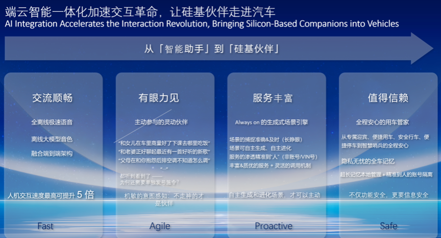 我们已在此方向进行探索,并完成了从被动服务到主动服务的交互范式的革命。实现这样的主动服务,不仅需要云端的服务调用,更依赖端侧的很强的能力以及端侧智能体的相应的能力。我们荣幸地能够与阿里巴巴通义实验室合作,在端上多模态基础模型上取得重要行业突破和进展,并与高通等芯片供应厂商紧密合作,优化端侧应用的适配与量化。相关实车体验已在大会上展示,而不只是一个实验室概念。我们相信,随着能力持续提升,我们能够将智能座舱的交互方式进行革命性的升级。