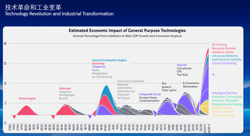 首先,回顾历史,我们可以看到技术革命与工业革命始终是相辅相成的关系。18世纪末的蒸汽机推动了现代化进程,促使世界GDP增长近3%。19世纪末的电力革命则带来了近10%的巨大经济提升。近代,以PC和互联网为代表的技术革命带来了更为显著的经济增长。而AI几乎是人类历史上能够影响人类经济发展的最大的重要的技术革命。同时,intelligent devices(智能设备)、advanced batteries(先进电池)、包括汽车相应的能力等也与AI共同构成这一变革浪潮。我们从事工程智能的同行,正有机会通过技术创新推动人类社会经济的快速发展。