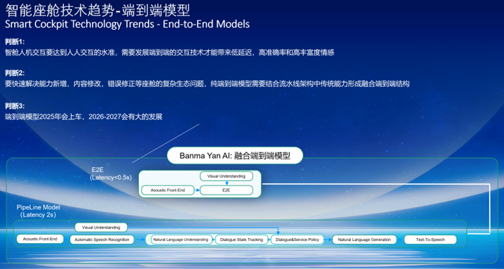 然而,智能座舱行业正发生深刻变革,技术日新月异,并将创造更大的产业与商业价值。一个关键的技术判断是:智能座舱AI技术将从流水线架构主导向端到端架构演进。这是因为传统流水线架构由多模块拼接而成,交互链路长,且模块间信息传递易导致重要信息丢失。所以我们期待用更加完善的端到端模型来替换流水线架构,其延迟可接近人与人交流的延迟水平。同时,由于我们用同一个模块来融合多种模态的信息,它有机会可以做的更准确、更加有感情。目前,端到端模型正逐步替代流水线架构,并在明后年会有着非常大的发展。其中端到端模型一个非常重要的趋势就是端到端模型在汽车端上的应用。
