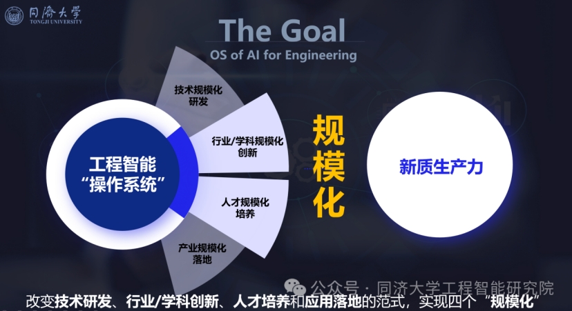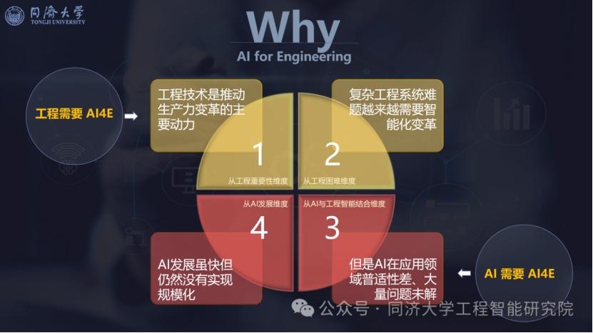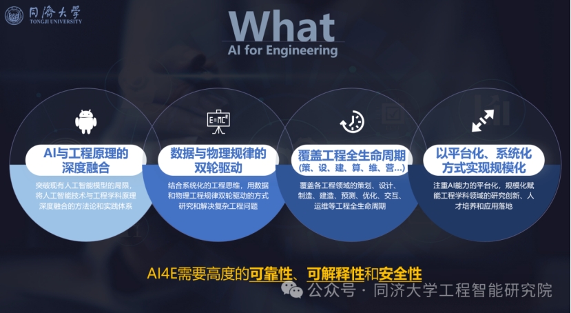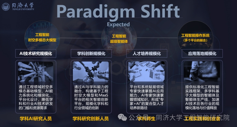 工程智能方向,同济大学在郑庆华院士的领导和倡导下也是第一次正式举起了这面旗帜,成立了世界上第一个工程智能研究院。现在讲工程智能的当然也不少,虽然没有科学智能那么多,但是真正举旗子的,同济是第一家,我也很有幸成为这个研究院的执行院长。当然,同济做工程智能有个比较独特的好处——做工程智能,有两个大的方向,要么是做工程的人往工程智能走,要么是做AI的人往工程智能走。我们在同济,既有很好的工程学科,也有不错的人工智能实力,可以两个方向放在一起走,可能会是更好一点的路径。