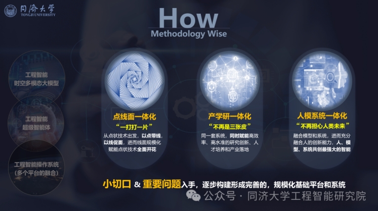 我们提出了三个工程智能研发的重要原则,或者叫methodology。第一个原则是叫点线面一体化,第二个原则是人模系统一体化,第三个原则是产学研一体化。