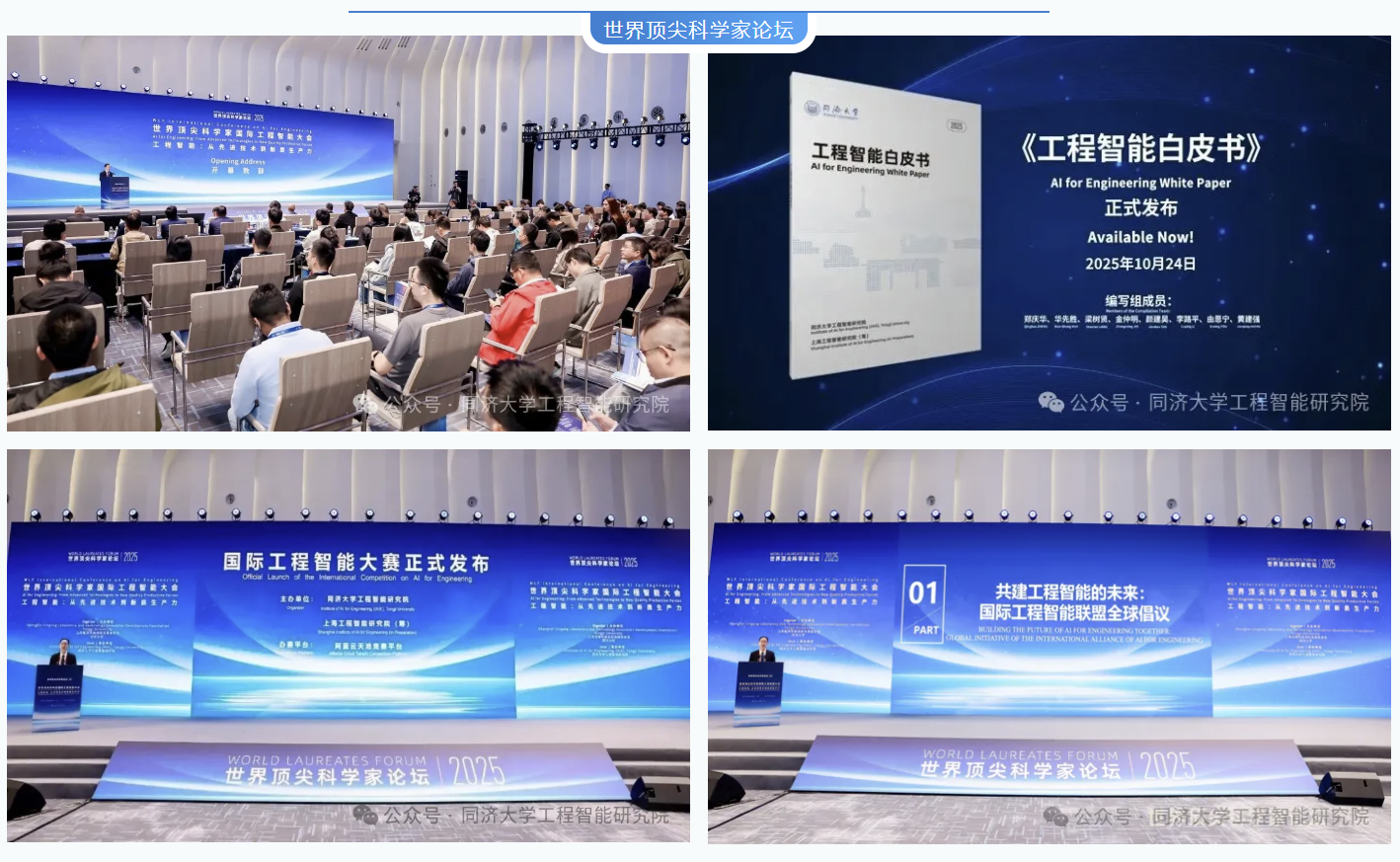 今年10月份,我们成功举办了世界顶尖科学家论坛中智能科学大会以及首届国际工程智能大会,有世界上顶尖的科学家参与,包括图灵奖、菲尔兹奖、沃尔夫奖得主。在这个大会上我们也发布了全球首部《工程智能白皮书》,获得了业界比较好的评价。其实同济的工程智能研究院也是世界上第一家以“工程智能”为主题的人工智能研究院。我们还启动了国际工程智能大赛,自11月份发布以来已经有300多个团队报名参加。我们也想通过大赛让更多人参与到工程智能的研究中,一起构建工程智能的大厦。我们还发布了国际工程智能联盟倡议,也即将发布面向工程智能的智算平台和AaaS(Agent as a Service)平台,去推动这个领域的技术研究和创新。