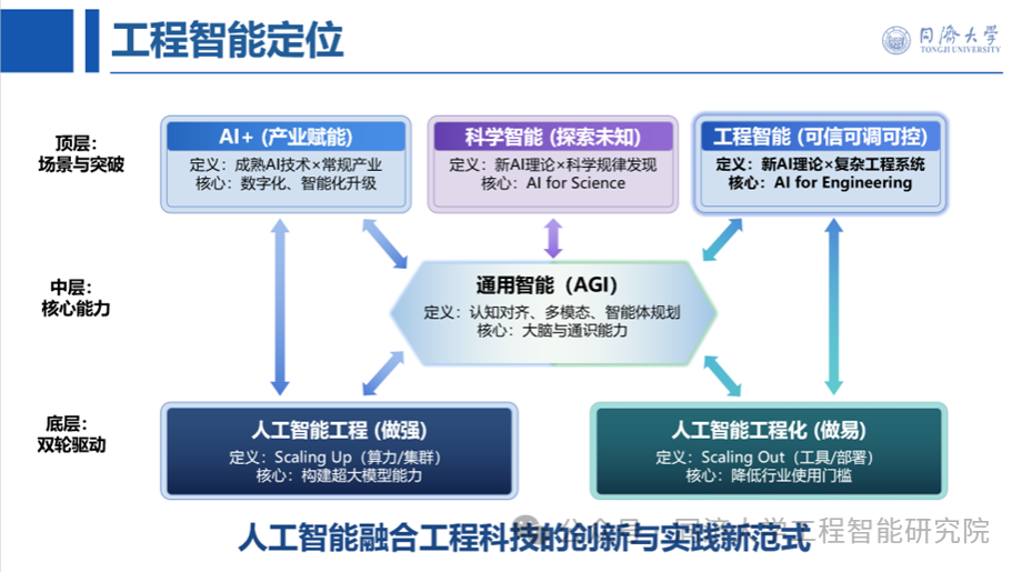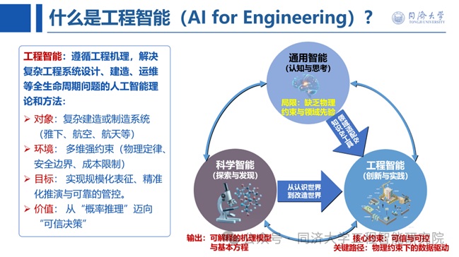 工程智能是面向“工程”问题的人工智能。狭义的工程,例如同济大学传统的强项,包括建造、制造、交通等等,广义的工程也包括科学领域和新兴领域的工程问题。这些领域里面的设计、建造、制造、运维等全生命周期的问题越来越复杂,对人工智能也提出了很多挑战。这些挑战用以往的工程科技解决起来没那么容易,用目前的人工智能技术,不管是通用智能还是科学智能,也难以解决。因为复杂工程系统对人工智能技术的要求会更高,需要可信、可控、可调,而且要真正地提升工程科研和实践的效率、质量和安全性,对精准度、机理、可解释性要求非常高。在这样一个背景下,我们提出了工程智能,即面向复杂的工程系统,研究新的人工智能的理论和方法,解决这些工程领域的难题,这是一方面,是工程需要工程智能。