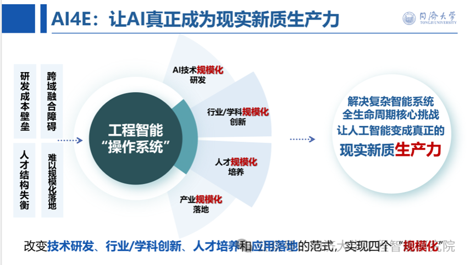 下面我介绍一下同济大学工程智能研究院。研究院成立于2025年5月20日,是学校直属的实体研究机构。研究院的基本功能定位是作为跨学科的枢纽和赋能平台。一方面是枢纽平台,连接人工智能与相关学科和行业,解决工程领域的“卡脖子”问题。另一方面是人工智能的技术高地。虽然工程智能是面向工程领域的,但也是落脚到人工智能上面,研究新的人工智能技术去解决复杂工程的问题。同时也是赋能中心,一方面赋能学科的发展,一方面赋能产业,实现规模化的人工智能落地和价值体现。